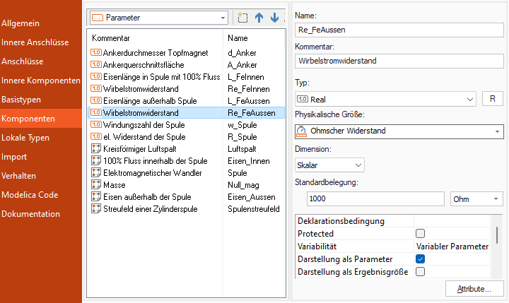 Bevor wir die interne Modellstruktur des Elektromagnet-Compound erweitern, ergänzen wir im Komponenten-Abschnitt dieses Compounds die Parameter Re_FeInnen und Re_FeAussen für die Wirbelstrom-Elemente:
