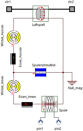 - Der äußere Eisenabschnitt liegt in der Modellstruktur parallel zum Spulen-Streufeld. Bei schnellen Flussänderungen bewirkt das Wirbelstrom-Element ein Vergrößern des magnetischen Widerstandes des Eisen-Flusszweiges. Der magnetische Fluss wird damit durch das Streufeld der Spule "gedrückt" und geht damit dem eigentlichen Arbeitskreis für diese Zeitspanne verloren.