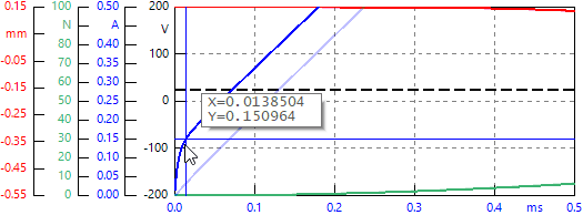 - Die Wirkung des implementierten Wirbelstromeffekts äußert sich hierbei in einer leichten Verzögerung des Abfallvorgangs. Der Stromsprung beim Einschalten liegt unter 1 mA und ist praktisch nicht erkennbar.