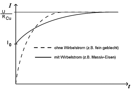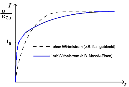 - Besitzt man infolge von Messungen (oder aus Erfahrung) den Wert I0 für den Stromsprung und kennt den Endwert Iend, so kann man daraus R_Wirbel berechnen:R_Wirbel = R_Spule·(Iend/I0 - 1)