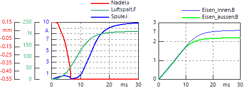 Restspalt = 50 µm (Parameter: Restluftspalt im angezogenen Zustand) K_FeInnen = 0.1xx (Parameter: Verhältnis der Eisenwiderstände mit xx=Nr.) L_Eisen = 7 * L_Anker (Variable: Länge des Eisenweges) L_FeInnen = K_FeInnen * L_Eisen (Variable: Eisenabschnitt mit 100% Fluss) L_FeAussen = L_Eisen − L_FeInnen (Variable: restlicher Eisenabschnitt) w_Spule = 500 (Parameter: Windungszahl der Spule) Rel_Spule = 1 Ohm (Parameter: el. Widerstand der Spule)