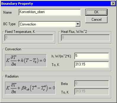 Die Konvektion zur Umgebungstemperatur von 40°C definieren wir als getrennte Boundary Property für die Ober- und Unterseite:
