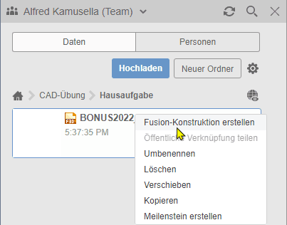 - (Herunterladen) Software CAD - Fusion-Tutorial - BONUS - Teamverwaltung Hochladen Datei in Projektordner.gif . . 635 × 259 . . 17 KB . . Alfred Kamusella . . 15:54, 13. Mai 2022