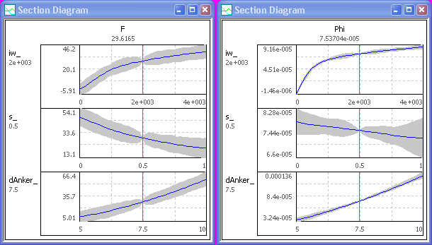 • Ändert man den aktuellen Wert der Streugröße dAnker_, so werden jeweils die zugehörigen 3D-Kennfelder dargestellt. Am welligsten sind die Kennfelder für einen Ankerdurchmesser von 5 mm: