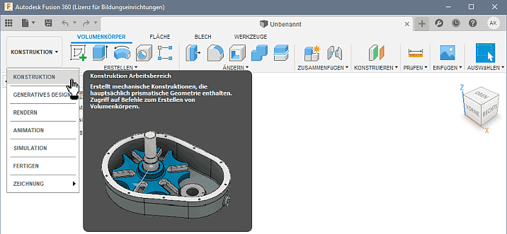 - So dient z.B. der Arbeitsbereich "Konstruktion" dem Erstellen mechanischer Konstruktionen unterschiedlichster Art. Dafür werden im Werkzeugkasten die benötigten Funktionen vom Skizzieren bis zum Prüfen der Modelle zur Verfügung gestellt.