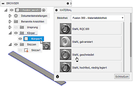 - Werkzeugkasten > Volumenkörper > Ändern > Material öffnet den Zugang zu den Material-Bibliotheken, von denen wir die "Fusion Materialbibliothek" benutzen: