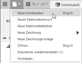 Am Anfang ist es nicht erforderlich, eine "neue Konstruktion" zu erstellen, weil eine solche bereits unter der Bezeichnung "Unbenannt" innerhalb eines neuen Projektes angelegt wurde. Es würde ansonsten nur eine zusätzliche "unbenannte" Konstruktionsdatei erstellt: