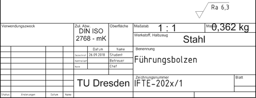 - Das Symbol für die Oberflächenbeschaffenheit passt nicht in die vorgesehene Schriftfeld-Zelle und wird deshalb oberhalb des Schriftfeldes platziert.