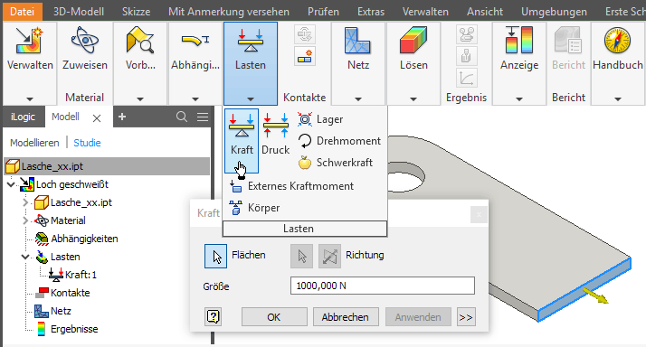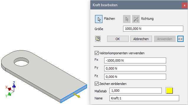- Standardmäßig wirkt die Kraft auf der Vektor-Normalen der gewählten Fläche. Man kann hier jedoch auch Vektor-Komponenten verwenden, da das Bauteil orthogonal am Ursprung verankert wurde: