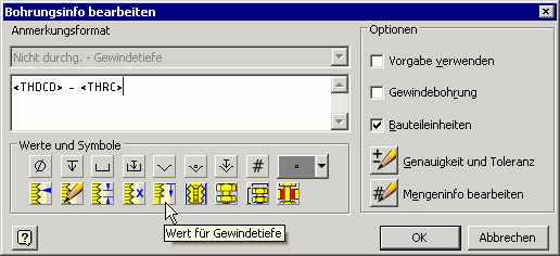 - Die Darstellung der Gewindeklasse kann man löschen und durch den Wert für die Gewindetiefe <THRD> ersetzen.