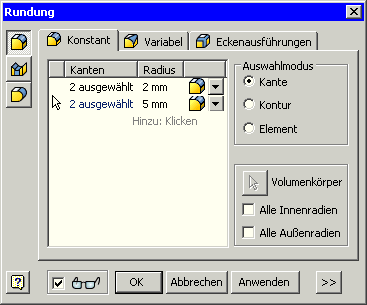 Zur Kantenbearbeitung stehen Fasen- und Rundungselemente zur Verfügung: