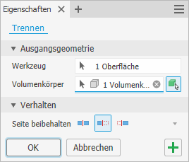 - Beim Verhalten kann direkt definiert werden, dass der oben liegende Teilkörper entfernt wird. Alternativ könnte man auch nur trennen und den Körper anschließend löschen.