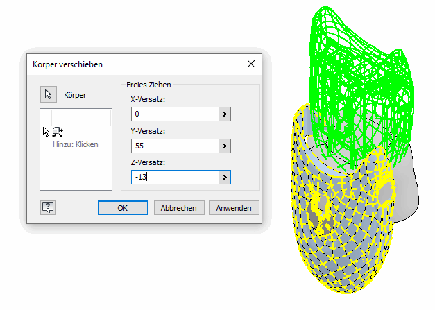 - Zum Verschieben wählt man MFL > 3D-Modell > Ändern > Körper verschieben (mit schwarzem Pfeil ausklappen). Jetzt muss man beide Körper wählen und diese um folgende Werte verschieben: X: 0 mm, Y: 55 mm, Z: -13 mm: