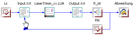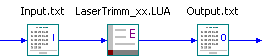 - Die im Workflow noch fehlende Anbindung der In- und Outputdateien an das Modell wollen wir nun nachholen. Dazu öffnen wir durch Doppelklick den Script-Dialog zu LaserTrimm.LUA und markieren die entsprechenden Input-/Output-Verbindungen: