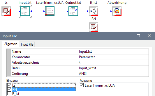 - Es fehlt noch die Zuordnung der Schnittlänge Ls und des Nennwiderstands RN zur Input-Datei. Nach Doppelklick auf Input.txt markiert man diese Input-Verbindungen: