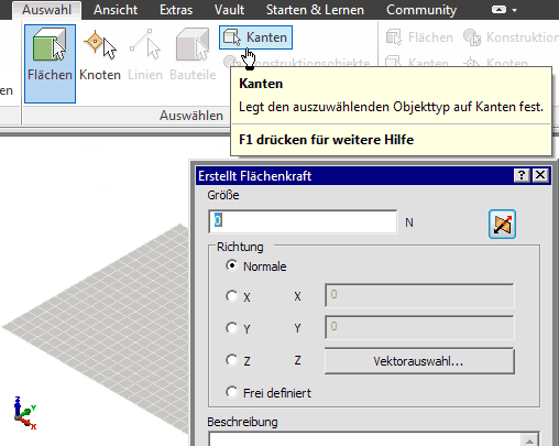 2. Zuerst Auswahl der Orte auf dem Netz (Flächen, Kanten oder Knoten), danach Definieren des Kraftvektors.