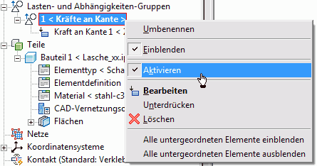 • Eine Lastengruppe ist die Analogie zum sogenannten Lastfall in anderen FEM-Programmen. Damit die darin enthaltenen Lasten bei der Simulation berücksichtigt werden, muss man die Gruppe aktivieren: