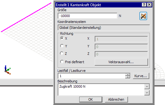 • Nach Auswahl der Kante kann man den Vektor der Kraft definieren: