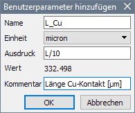- Damit bei sich ändernder Widerstandsgeometrie eine automatische Anpassung der Kupfer-Kontaktlänge erfolgen kann, wird ein zusätzlicher Benutzer-Parameter L_Cu=L/10 definiert.