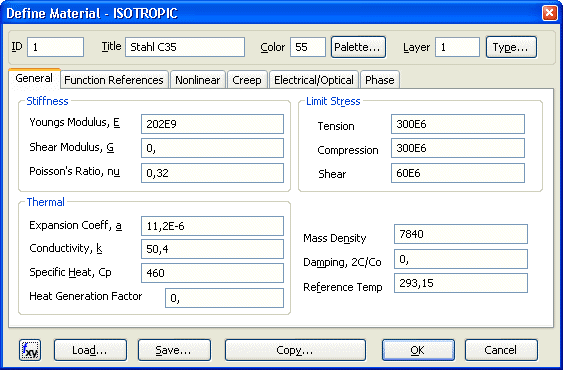 E-Modul = 202E9 N/m² Querkontraktionszahl = 0,32 Linearer Ausdehnungskoeff.=11,2E-6 /K Spez. Wärmeleitfähigkeit=50,4 W/(m*K) Spezifische Wärme=460 J/(kg*K) Massedichte=7840 kg/m³ Bezugstemperatur=293,15 K (=20°C) Streckgrenze=300E6 N/m² (=300 MPa) Druckbelastungsgrenze=300E6 N/m² (=300 MPa) Scherbelastungsgrenze=60E6 N/m² (=60 MPa)