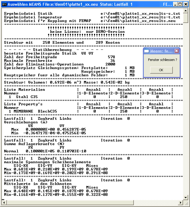 FEMAP muss auf die Beendigung des MEANS-Solvers warten. Dies geschieht über das kleine Quittungsfenster. Hier sollte man erst OK drücken, nachdem man den Inhalt des MEANS-Protokolls gelesen hat!
