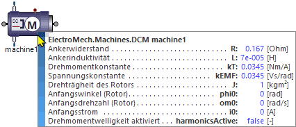 - Bewegt man danach dort den Cursor über dieses Modell-Element, erscheint ein kleines Fenster mit den aktuellen elektrischen und mechanischen Parameterwerten: