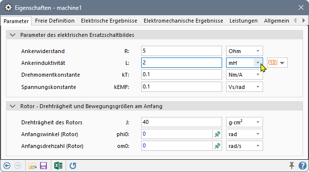 - Hier tragen wir die "richtigen" Parameter ein. Dabei muss man beachten, dass man die richtige Maßeinheit gewählt hat (z.B. bei der Ankerinduktivität H umgeschaltet auf mH):