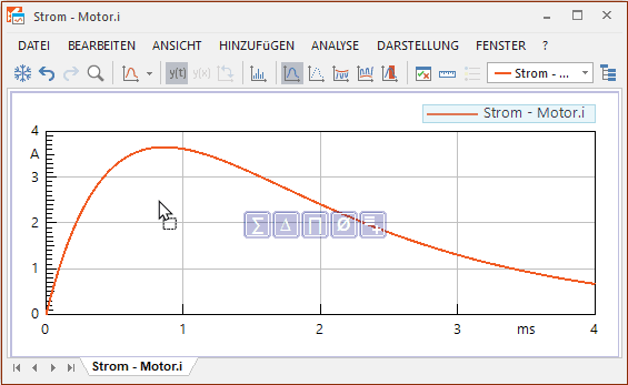 Wenn ein elektrischer Strom durch die Spule des Motors fließt, wird ein Drehmoment erzeugt und der Motor beginnt sich zu drehen. Diesen Vorgang werden wir jetzt mit dem Modell simulieren. Zusätzlich zum Strom wollen wir das Drehmoment des Motors als Signalverlauf darstellen: