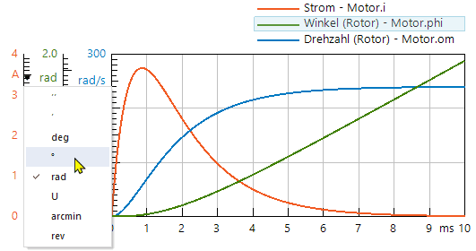 - Anstatt der Maßeinheit rad wollen wir die anschaulichere Einheit ° verwenden (Hinweis: das Grad ° ist identisch mit deg). Das bewerkstelligt man einfach über das Menü an der Maßeinheit: