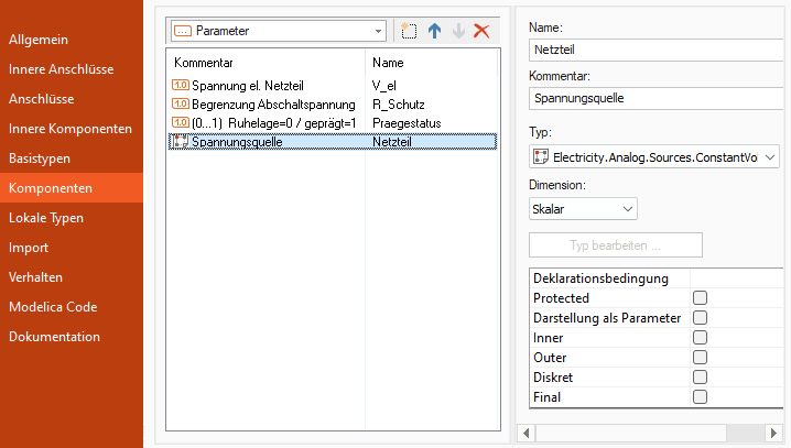 Damit man den Elektromagneten bei Bedarf für unterschiedliche Betriebsspannungen dimensionieren kann, wurde dieser Spannungswert als Compound-Parameter definiert und wird nun der Spannungsquelle zugewiesen: