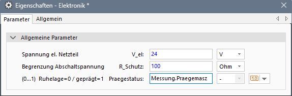 Prinzipiell sind die Parameter der Elektronik-Baugruppe (Betriebsspannung und Schutzbeschaltung) Bestandteil der CAD-Daten. Vorläufig konfigurieren wir diese Werte noch direkt ín den Eigenschaften des Elektronik-Compounds: