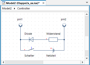 In der geöffneten Modelldatei öffnen wir für den Controller-Compound die Strukturansicht, um die erforderlichen Bauteile zur bereits vorhandenen Spannungsquelle hinzuzufügen: