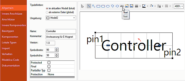 Das automatisch generierte Symbolbild (nur "Spannungsquelle") widerspiegelt nicht ansatzweise die komplexe innere Struktur der Controller-Baugruppe. Deshalb verzichten wir darauf und kreieren minimalistisch den Text "Controller" innerhalb der umrahmten Symbolfläche: