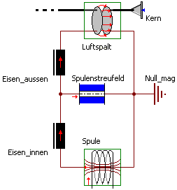 Man erkennt deutlich, dass nur der dem Arbeitsluftspalt abgewandte Teil des Magnetkerns (Eisen_innen) vom kompletten Spulenfluss durchflossen wird. Dort sollte man die magnetische Durchflutung (MMK) der Spule als konzentriertes Netzwerk-Element platzieren.