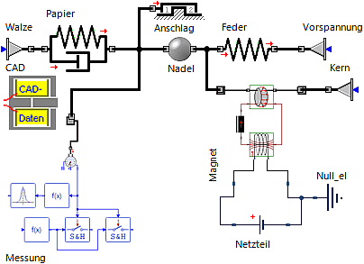 Die Magnetkraft drückt die Nadel dauerhaft auf das Papier, da im Modell keine Abschaltung vorgesehen wurde.