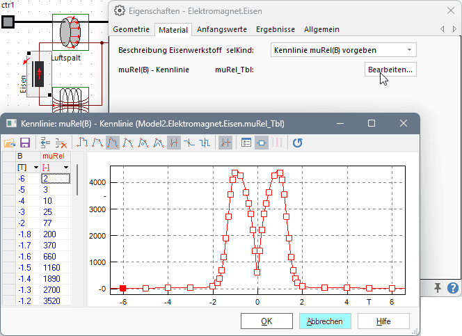 Der Zugriff auf diese Werte kann über verschiedene Methoden erfolgen. Der Anschaulichkeit halber wählen wir den Zugang über die Kennlinie muRel(B). Auf diese kann man dann in der Material-Registerkarte mittels "Bearbeiten" zugreifen: