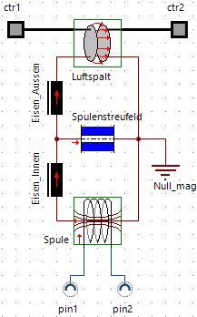 Für die Verbindungen zwischen den Compound-Elementen und der Rest der Modellstruktur werden passende Schnittstellen generiert. Im Beispiel sind dies ctr1 und ctr2 (translatorische Mechanik-Konnektoren), welche die mechanischen Anschlüsse des Luftspalts nach außen führt.