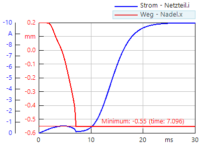 Nach der Simulation konfigurieren wir ein Ergebnisfenster mit dem Stromanstieg und dem Verlauf der Nadel-Bewegung: