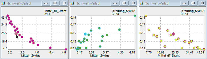 - Die Streuungen der Zykluszeit und der Spulentemperatur spielen keine wesentliche Rolle, weil diese für die Lösungen der Paretomenge bereits minimiert sind.