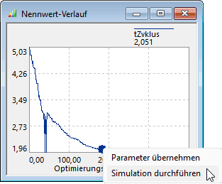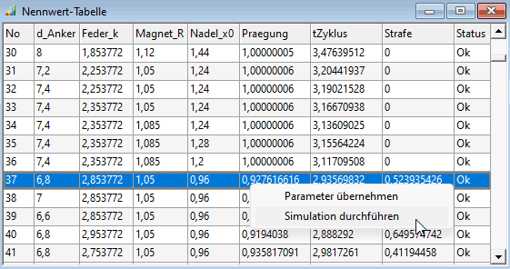 - Analog zu den Nennwert-Verläufen steht in der Nennwert-Tabelle das Kontext-Menü für jeden Optimierungsschritt zur Verfügung. Falls man sich dafür interessiert, was im Detail bei nicht vollständigem Prägen passiert, kann man einen entsprechenden Optimierungsschritt auswählen und die Simulation mit diesen Parametern starten.