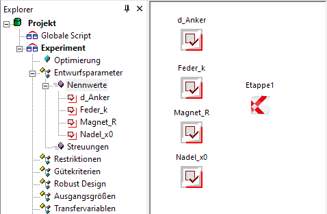 Die Eigenschaften der Entwurfsparameter werden auf Basis der aktuellen Modellwerte mit Standard-Annahmen versehen: Startwert: