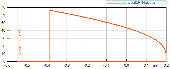 Deshalb wollen wir den Verlauf F=f(x) für die optimal angepasste Einschaltdauer näherungsweise nachbilden. Den erforderlichen Verlauf sehen wir in der Darstellung Luftspalt.Fi=f(Nadel.x) → beide Signale in ein Ergebnisfenster ziehen und y(x)-Darstellung wählen: