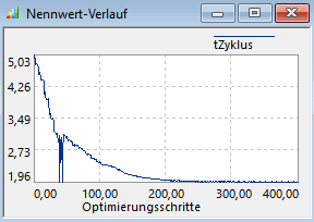 Die Gütefunktion wird in unserem Beispiel nur durch das Gütekriterium tZyklus gebildet. Während der Optimierung wird als Nennwert-Verlauf praktisch ein Höhenprofil des auf der Oberfläche der Gütefunktion zurückgelegten Pfades abgebildet. Der Wert der Zykluszeit ist bisher eine Funktion von den vier Entwurfsparametern: