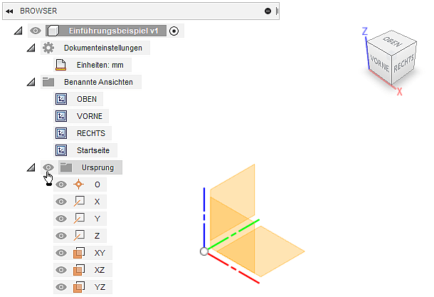 - Die Achsen und Flächen des Ursprung-Koordinatensystems kann man über die Schaltflächen im Browser sichtbar machen.