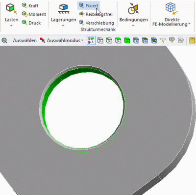 - Wir wählen im Grafikbereich den Lochrand der Lasche und setzen die Randbedingung auf "Fixiert"