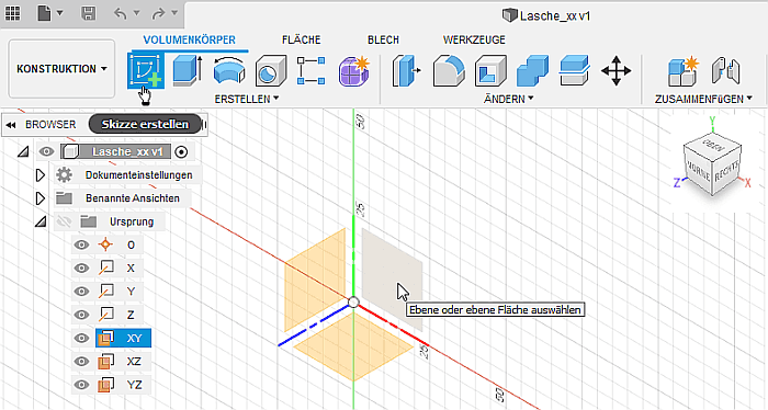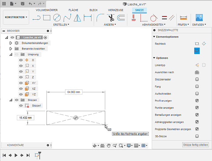 - Die Skizze1 erscheint im Browser in einem Skizzen-Ordner und außerdem als erste Operation unten in der Zeitleiste.